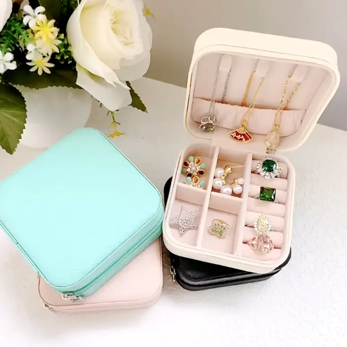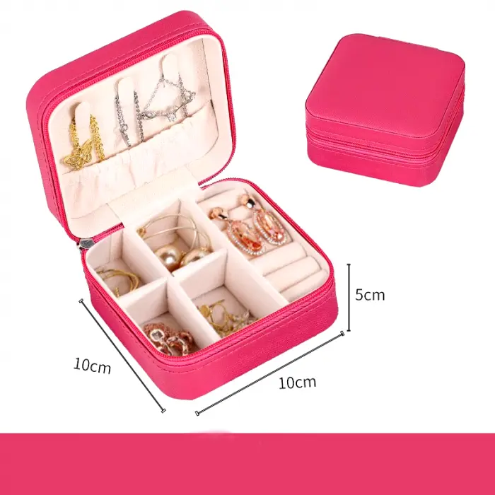 Hermoso joyero cuadrado compacto, fabricado en cuero PU que hace que sea sencillo el mantener ordenadas y cuidadas tus joyas.