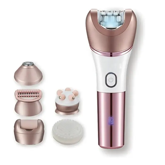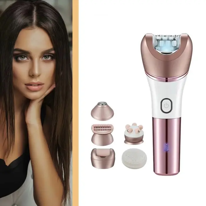 Multifunción 6 en 1: Incluye cabezales intercambiables para diversas necesidades: depilador, rasurador, recortador, masajeador, removedor de callos/exfoliador y un cabezal de masaje de alta frecuencia.