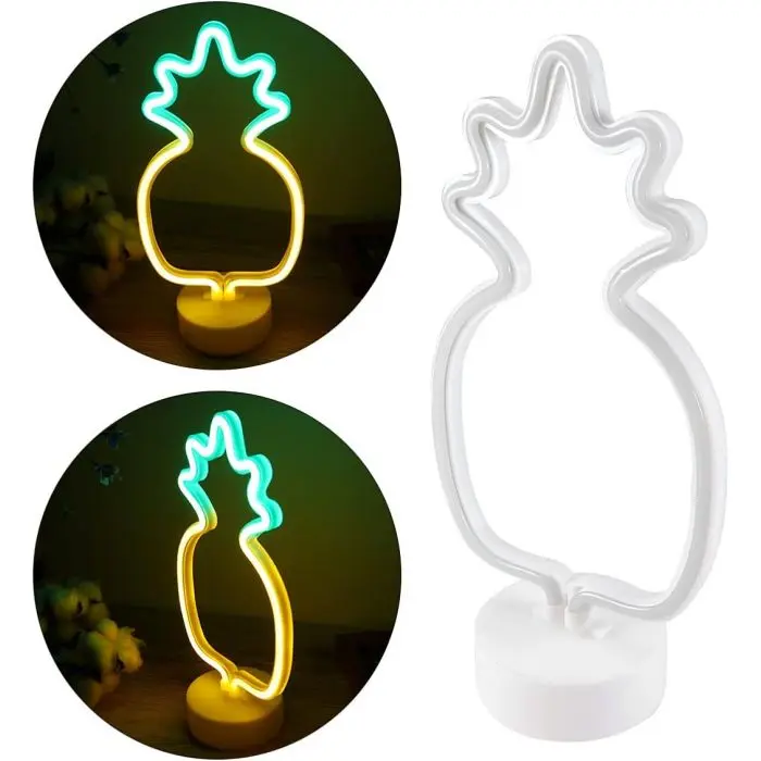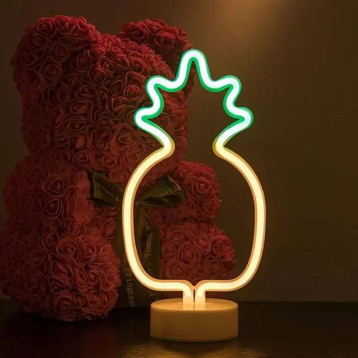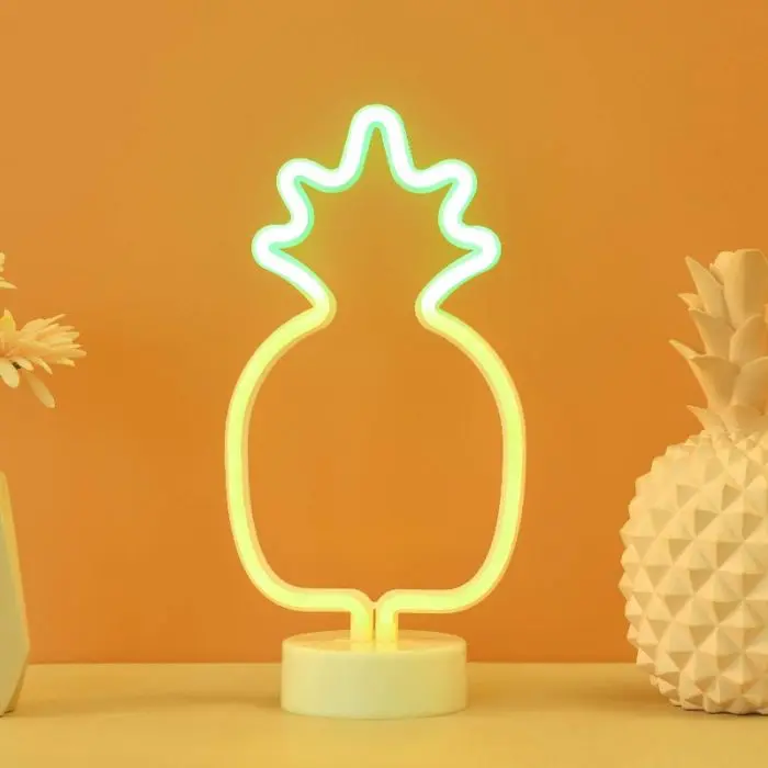 Lampara led de mesa. Diseño de ananá.Color amarillo y verde.Funciona con 3 pilas AA. No incluye las pilas.Medidas aproximadas: 26cm